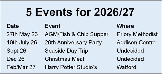 We also arrange bi-monthly Events and Outings in venues used by the wider community.